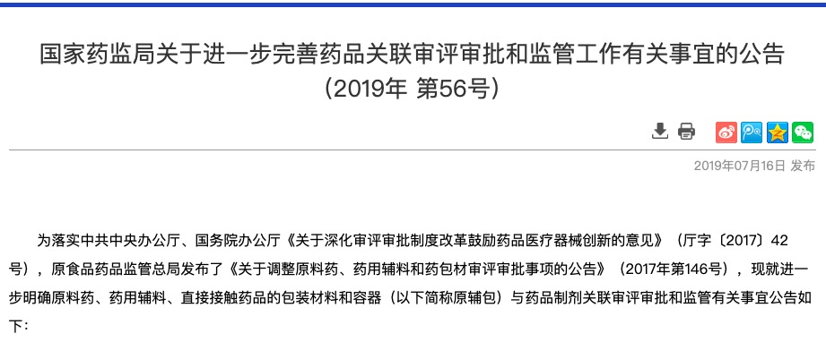 为落实中共中央办公厅、国务院办公厅《关于深化审评审批制度改革鼓励药品医疗器械创新的意见》(厅字〔2017〕42号),原食品药品监管总局发布了《关于调整原料药、药用辅料和药包材审评审批事项的公告》(20